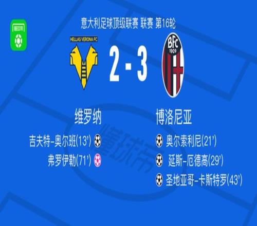 北京时间1月16日,意大利足球顶级联赛第16轮,维罗纳坐镇主场迎战博洛尼亚。比赛开局阶段,贝内德送出助攻,吉夫特-奥尔班破门得分,帮助维罗纳取得领先。随后博洛尼亚迅速做出回应,弗罗伊勒助攻奥尔索利尼完成进球,将比分扳平。紧接着,本哈明-多明格斯送出传球,延斯-厄德高推射建功,博洛尼亚反超比分。临近上半场结束,波贝加送出精准助攻,圣地亚哥-卡斯特罗冷静破门,进一步扩大领先优势。进入下半场,弗罗伊勒不慎自摆乌龙,为维罗纳追回一球。此后双方均未能改写比分,最终全场结束,维罗纳2-3不敌博洛尼亚。