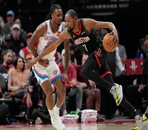 NBA常规赛,火箭坐镇主场迎击雷霆。本场比赛之前,火箭23胜14负排名西部第6,过去4场比赛他们输掉3场,被开拓者双杀,惨败倒数第一的国王,从阵容上看,火箭真的很强,全员天赋都是顶级,联盟平均身高最高的一支球队,去年夏天还引进了超级巨星杜兰特。然而,一番比赛下来却发现,光有天赋还是不行,火箭现在的投射有点糟糕,连着几场三分命中率都只有两成,再加上缺少控卫组织,他们暂时很难上升到争冠高度。另一边的雷霆队,34胜7负排名西部第一,近期雷霆又轰出4连胜,他们依然是现在最有统治力的一支队伍。