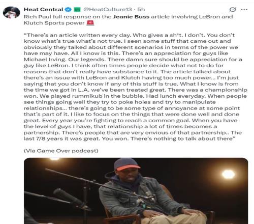 里奇-保罗在一档播客节目中谈到ESPN对珍妮-巴斯的报道:我根本不在乎(脏话),我看到了他们很多不同角度的东西,甚至关于操控湖人的一些言论,但谁XX在乎啊。
